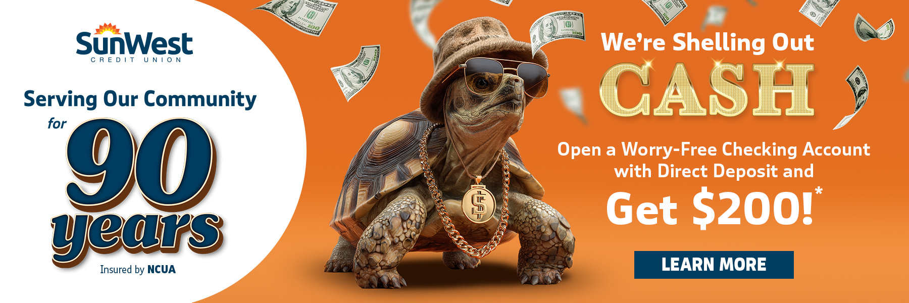 At SunWest, our checking accounts are simple. No monthly service fees, no minimum balances and a Visa debit card with no annual fee. Plus, you can get your debit card the same day!