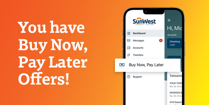 - BNPL offers are found in SunWest Credit Union’s Digital Banking app, located in the “Buy Now, Pay Later” tab.
